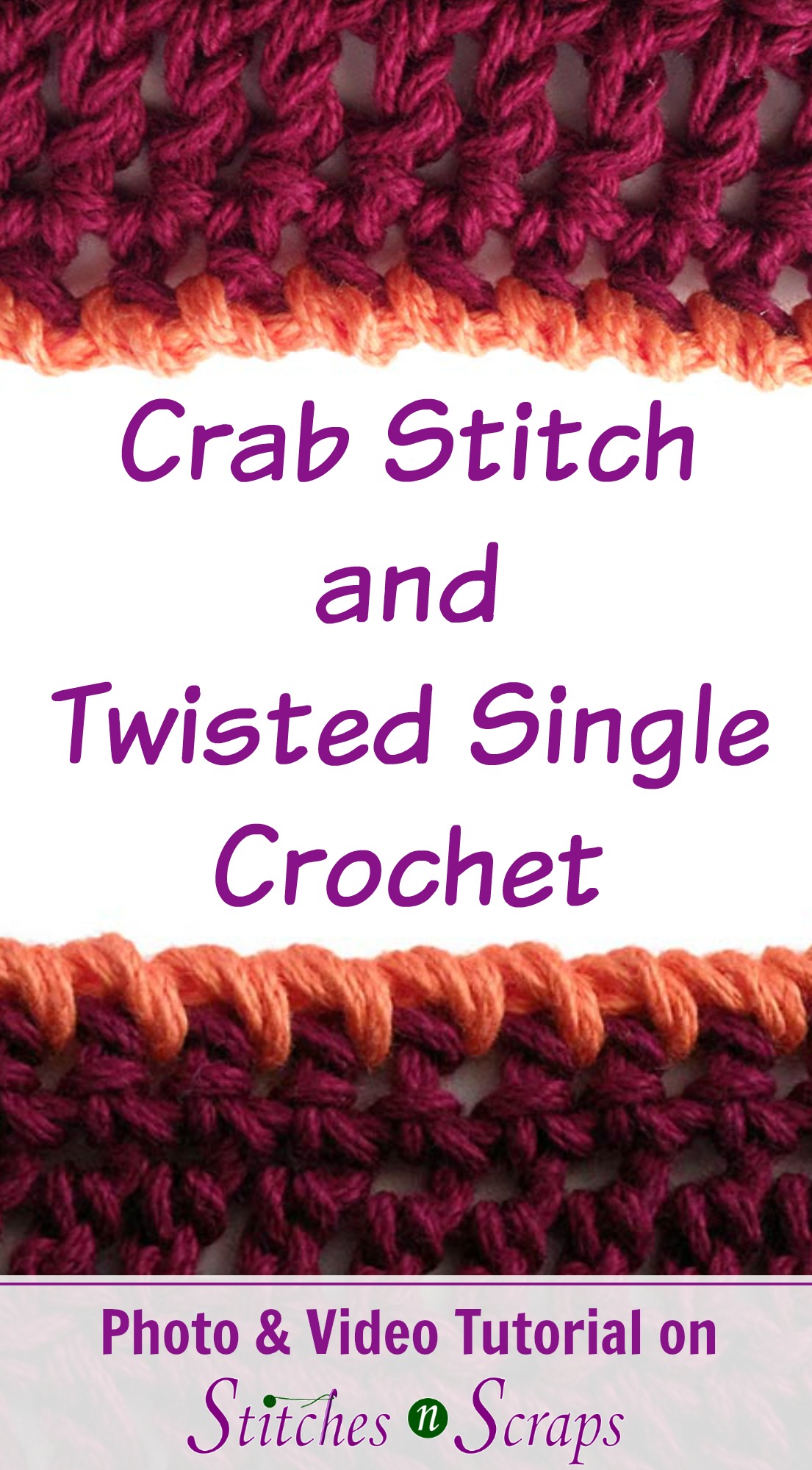 Crab stitch was one of the first decorative, single row edgings I learned. It creates a rope like edge by working backwards (from left to right). I recently learned a stitch called the twisted single crochet, which creates a very similar edge, but working forwards.