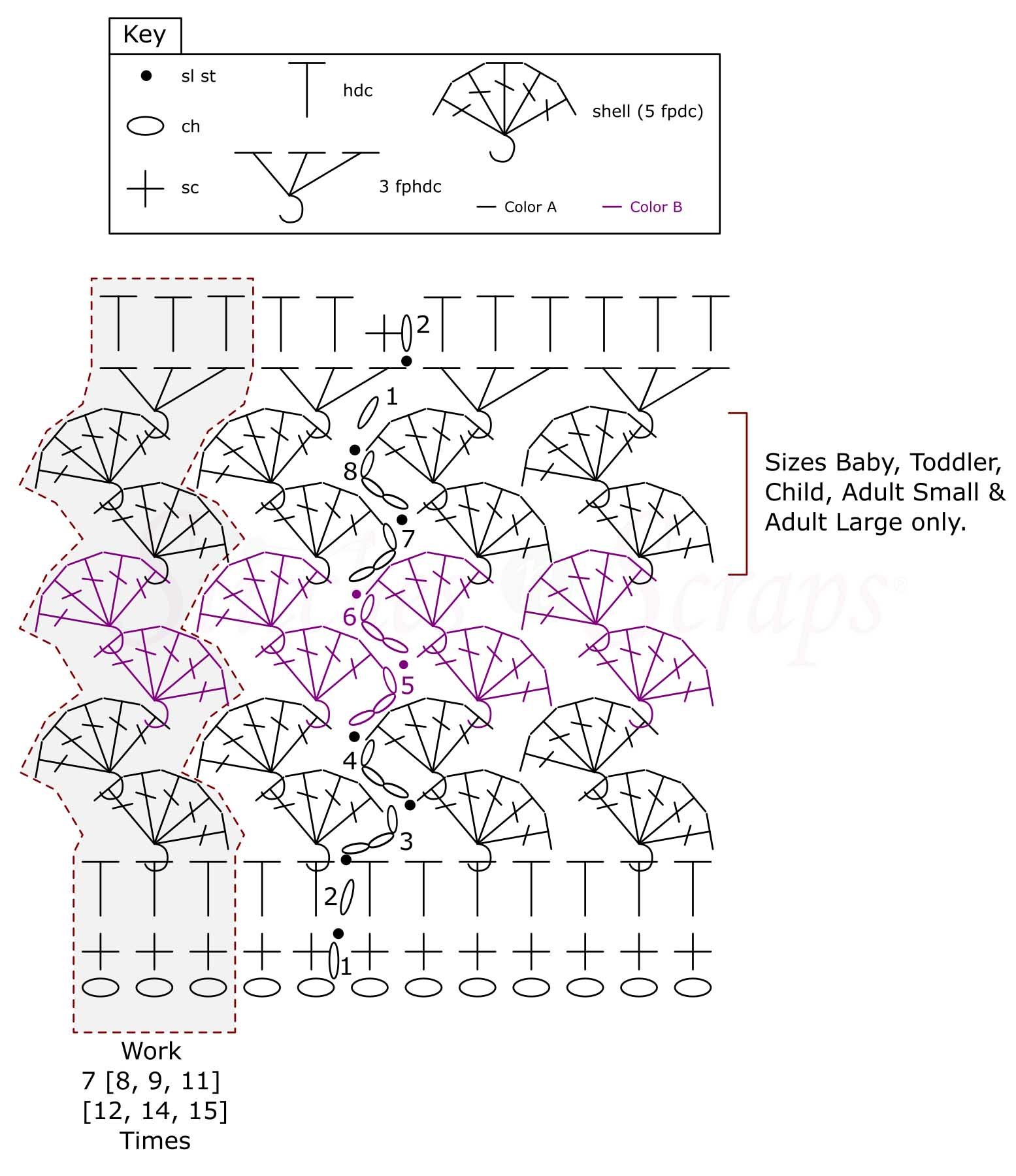 For remainder of Crown, each size starts on a different rnd number as indicated.